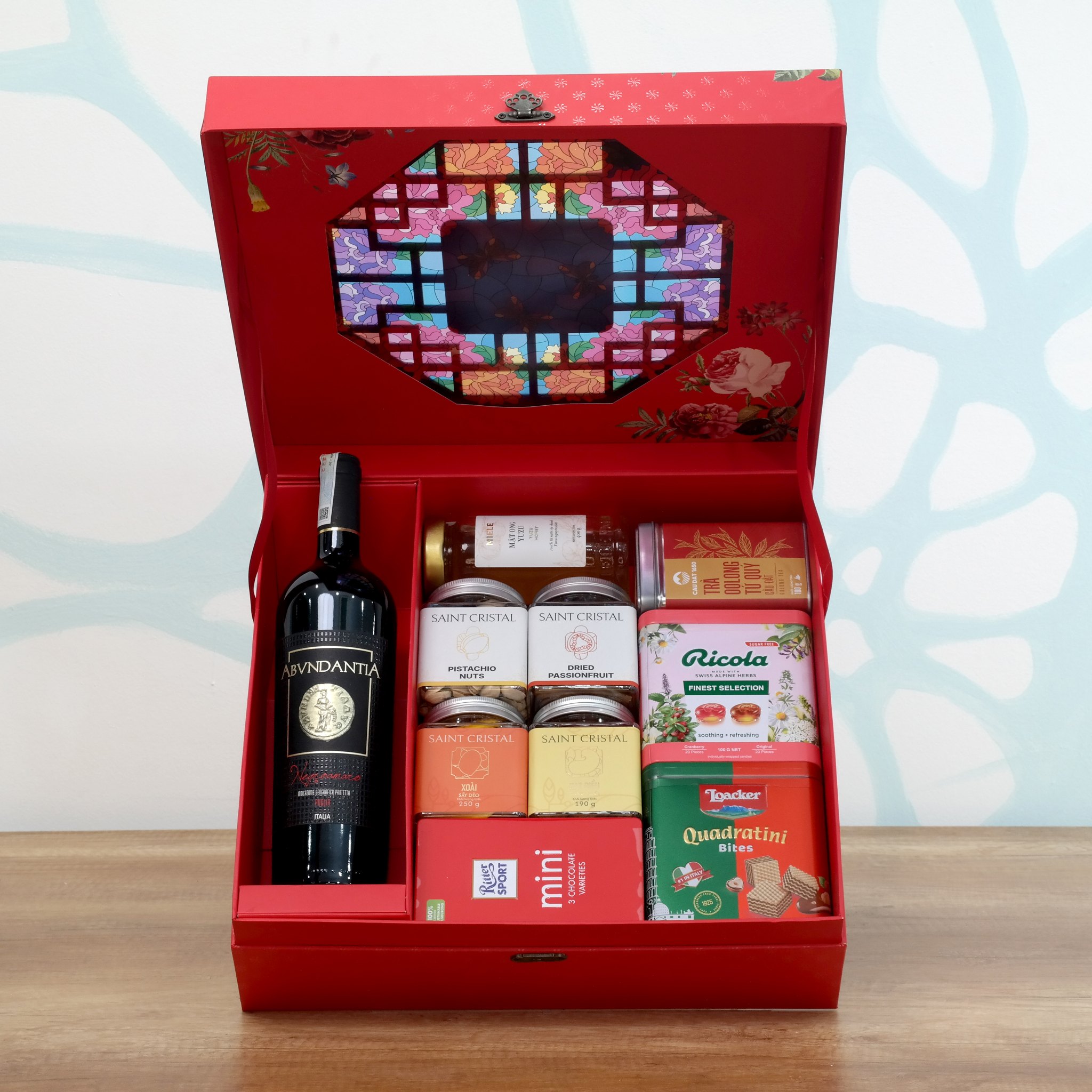 Hộp Quà Tết Xuân 2325 trong danh sách hộp quà Tết đối tác nước ngoài gây ấn tượng với chai rượu vang đỏ Ý Fantini Gran Sasso Alta Quota Montepulciano d’Abruzzo mang hương vị đậm đà của trái cây đỏ và mùi gia vị ấm áp. Đây là sự lựa chọn hoàn hảo để làm nổi bật hộp quà Tết dành cho đối tác quốc tế.