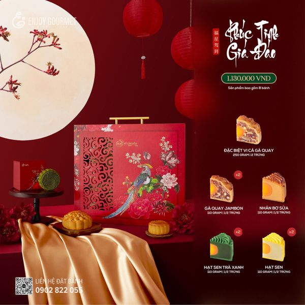 Lễ hộp Phúc Tinh Giá Đáo, gồm 8 bánh:Điều đặc biệt của bánh trung thu của Hỷ Lâm Môn đó là sự đa dạng với đầy đủ các vị thơm ngon và có những chiếc bánh có kích thước lớn đặc biệt. Những chiếc bánh tuyệt hảo sẽ quây quần cùng nhau trong chiếc hộp sang trọng. Thể hiện được niềm vui gia đình sum vầy cùng thưởng thức trà, bánh và ngắm trăng rằm tháng 8 thật ấm áp bình yên. Hỷ Lâm Môn sẽ mang ánh trăng tròn đến với mọi gia đình Việt, như lời chúc phúc một Trung Thu viên mãn, đủ đầy. Cũng giống như cách mà cơ sở sản xuất bánh trung thu Hỷ Lâm Môn gửi gắm tâm huyết vào thương hiệu, mang đến niềm vui cho mỗi gia đình Việt Nam.