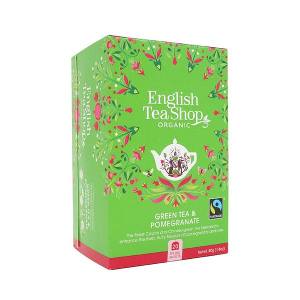 Trà Organic Green Tea & Pomegranate English Tea 20 gói là trà xanh hữu cơ với lựu và cánh hoa hồng. Ceylon và trà xanh Trung Quốc hảo hạng nhất được pha trộn để tăng thêm hương vị trái cây tươi mát của lựu và hoa hồng. Trà túi lọc là một sản phẩm vô cùng tiện lợi và rất được ưa chuộng trong cuộc sống hiện đại. English Tea Shop mang đến nhiều loại trà hữu cơ thơm ngon tuyệt vời giúp người dùng sảng khoái tinh thần bởi những hương vị đặc biệt.